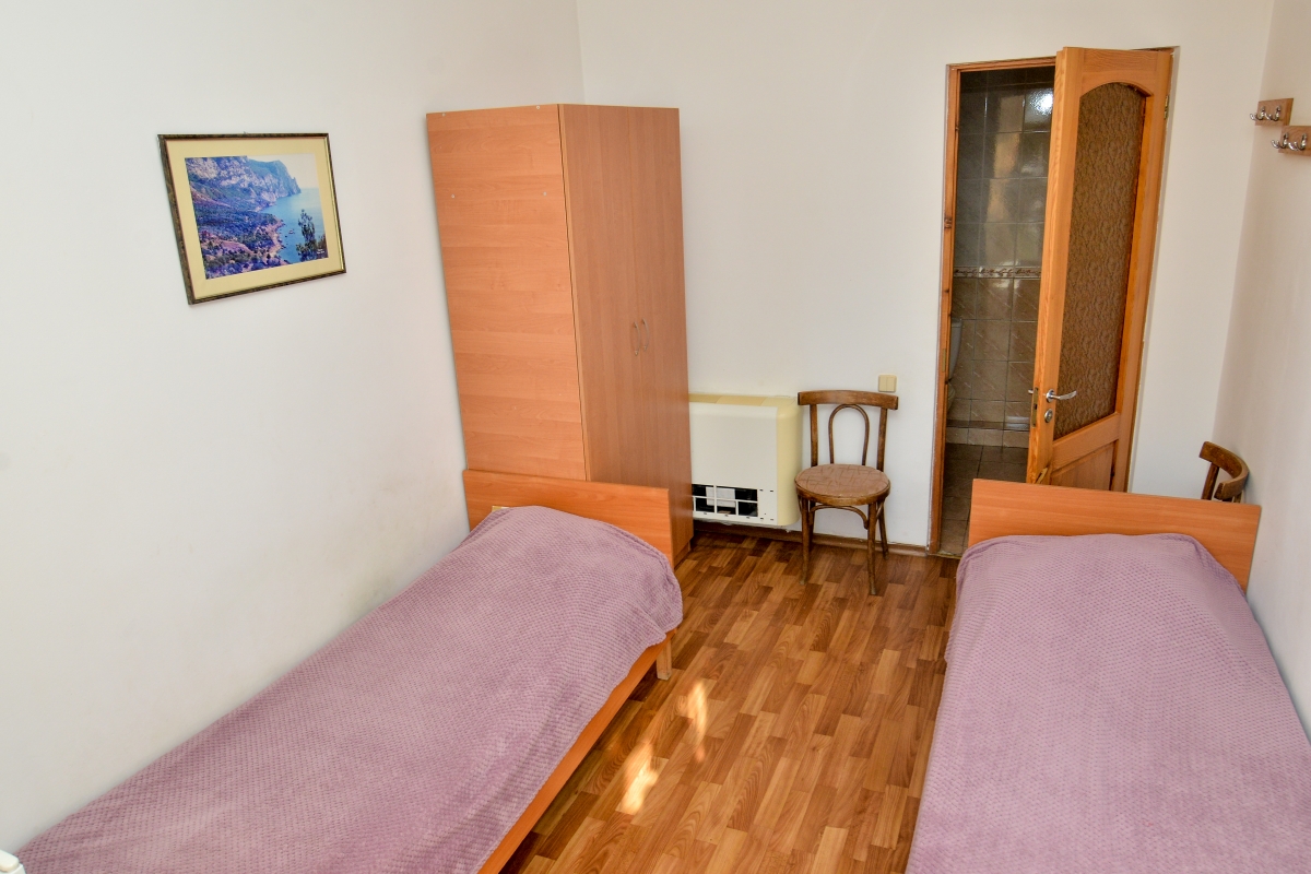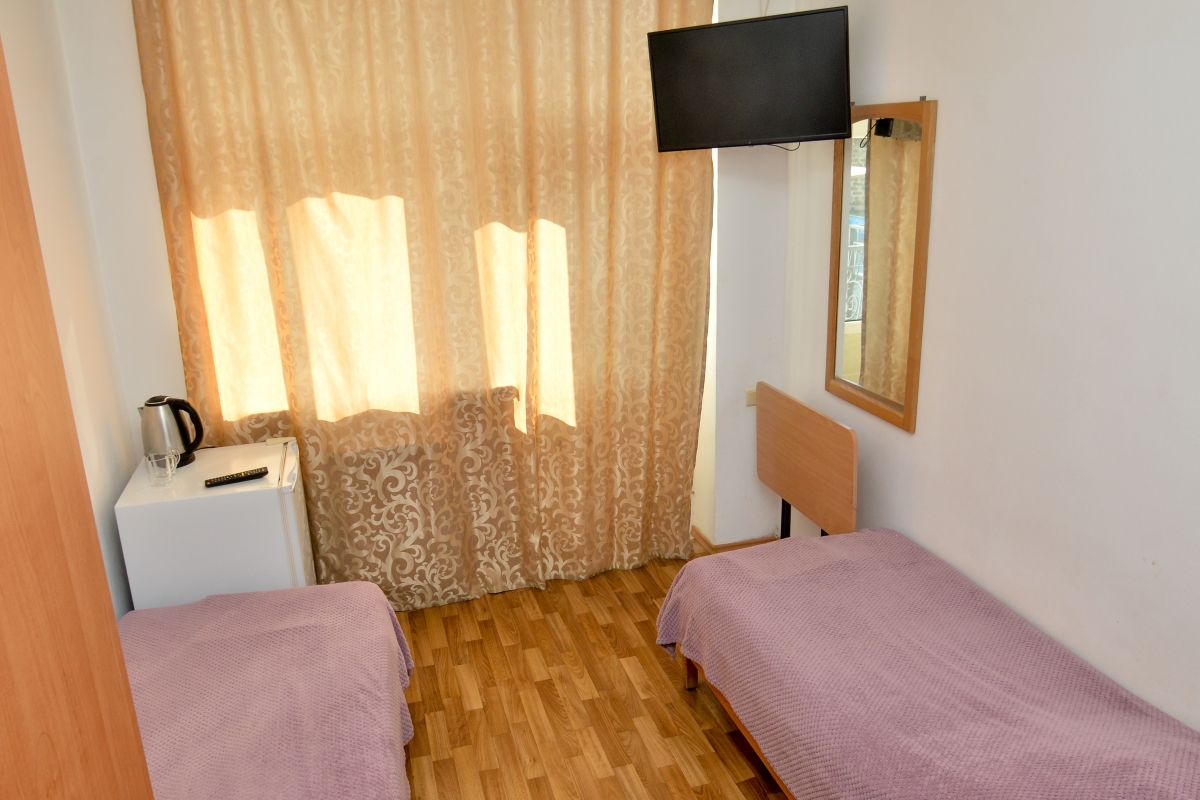 Номер Стандарт рассчитан на двух человек, площадь 15кв.м. В номере есть две односпальные кровати, журнальный столик. Кондиционер, электрический чайник, холодильник, телевизор, телефон, санузел с душевой кабиной, сушилка для белья.