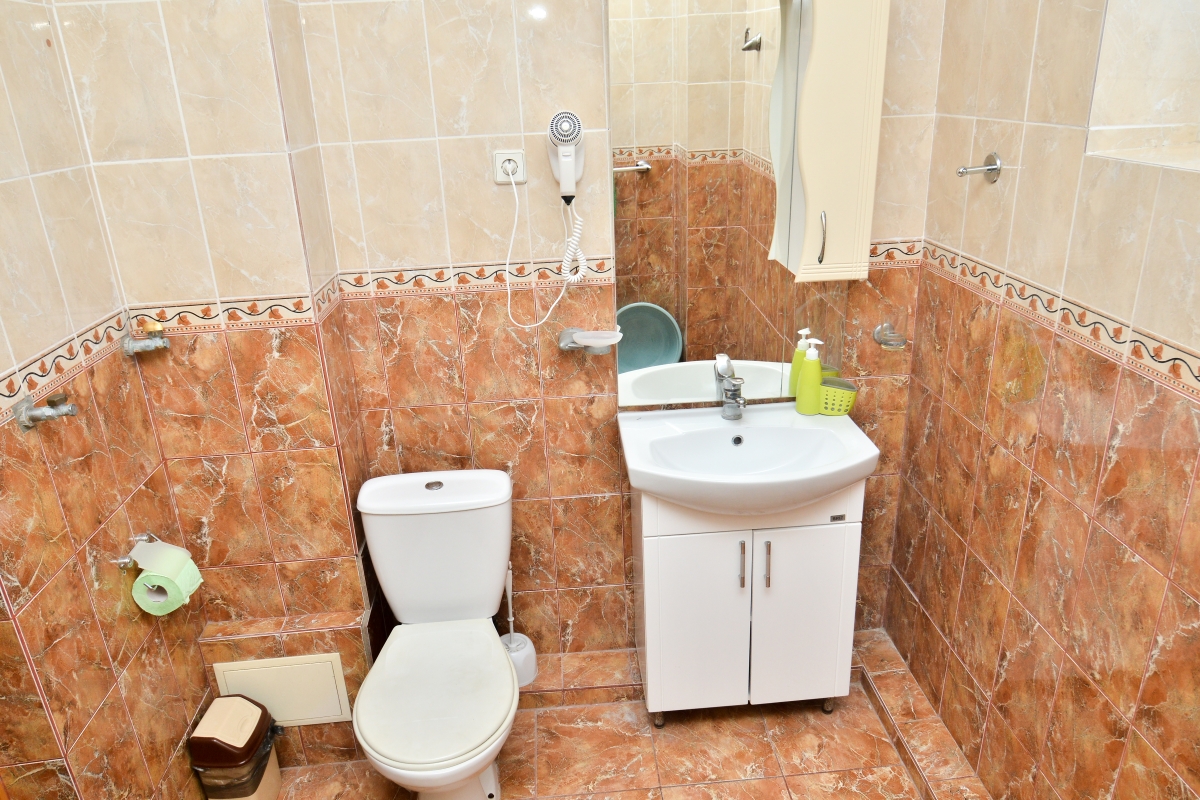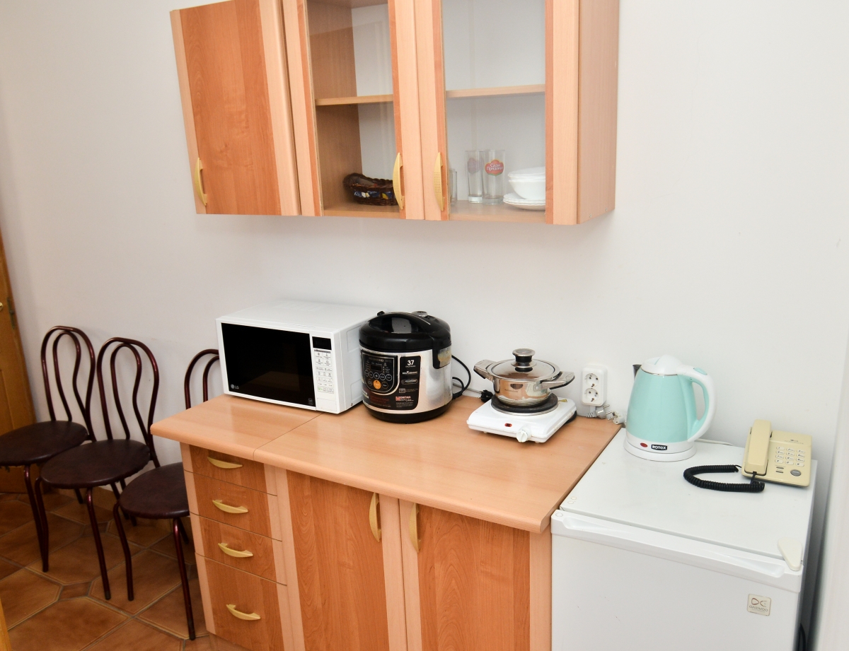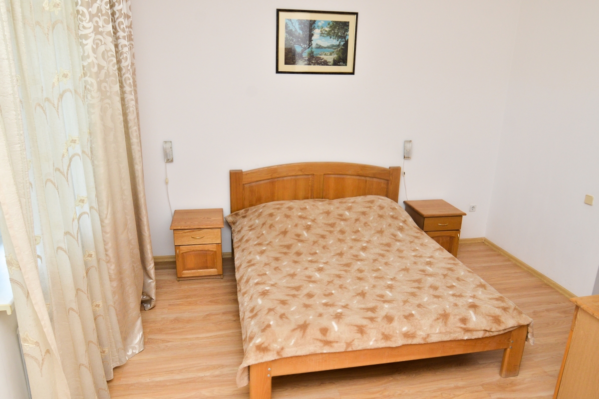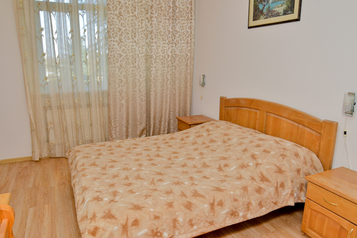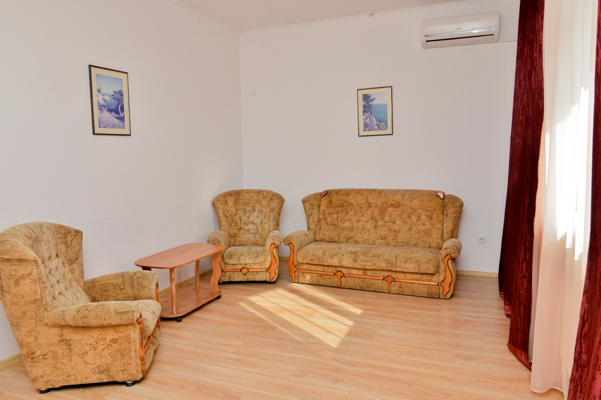 Стандарт улучшенный (с двумя балконами) рассчитан на трёх человек, площадь 60 кв.м. Возможно дополнительное место. Две изолированные комнаты. Первая комната: большой диван-кровать, журнальный столик, телефон, мягкие кресла, телевизор. Вторая комната: большая двуспальная кровать, шифоньер, прикроватные тумбочки, трельяж с зеркалом. В номере есть: электрический чайник, мультиварка, электроплита, микроволновая печь, набор посуды, холодильник, кондиционер — 2 шт, фен, Санузел с душевой кабиной, сушилка для белья. Номер оснащён эко-мебелью из натурального дерева, все межкомнатные двери также из натурального дерева.